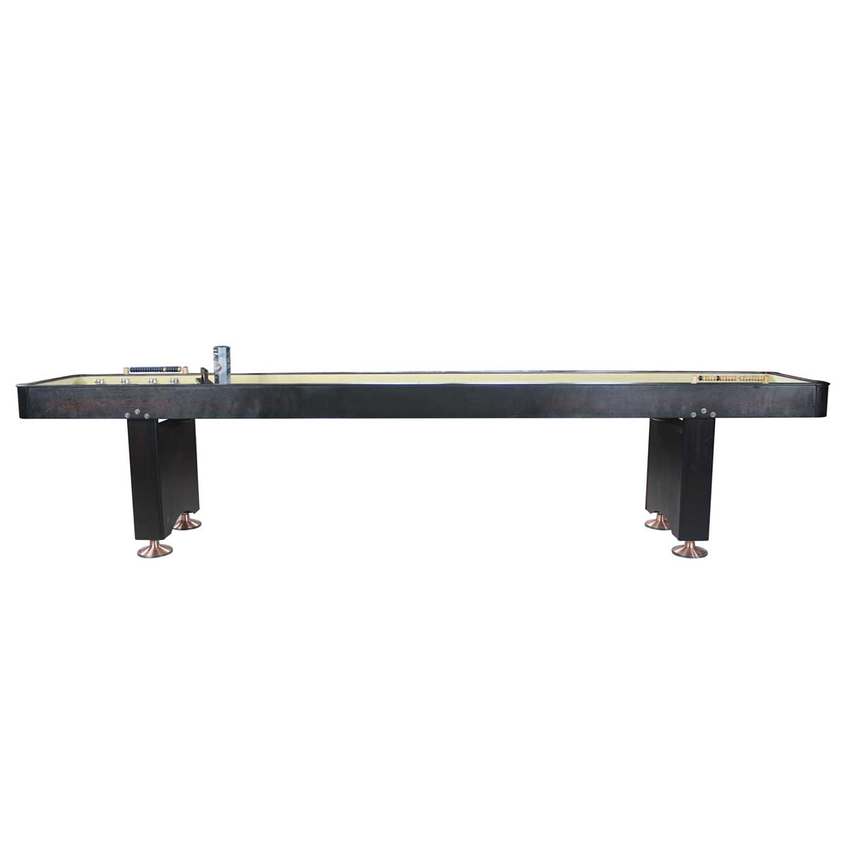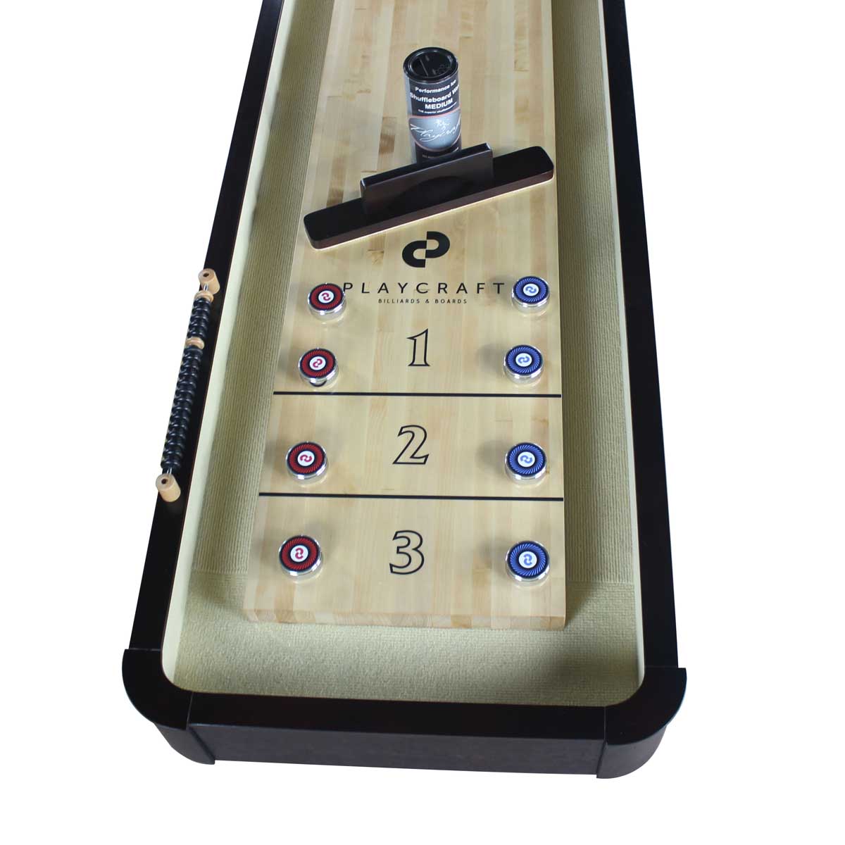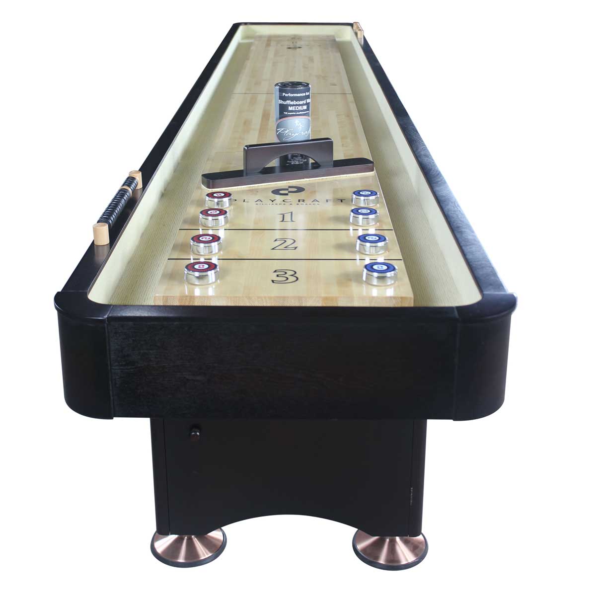 The Georgetown shuffleboards are gorgeous tables with real wood features that will accent any home setting. As with all of our Home style tables, the playfield is a hardwood solid butcher block that is 15" wide, 1.75" thick and one foot less than the overall length of the shuffleboard in question. When comparing manufacturers, make sure to look for a 1.75" thick playfield, as the extra depth looks better in the cradle and feels better on the hand when setting a puck.