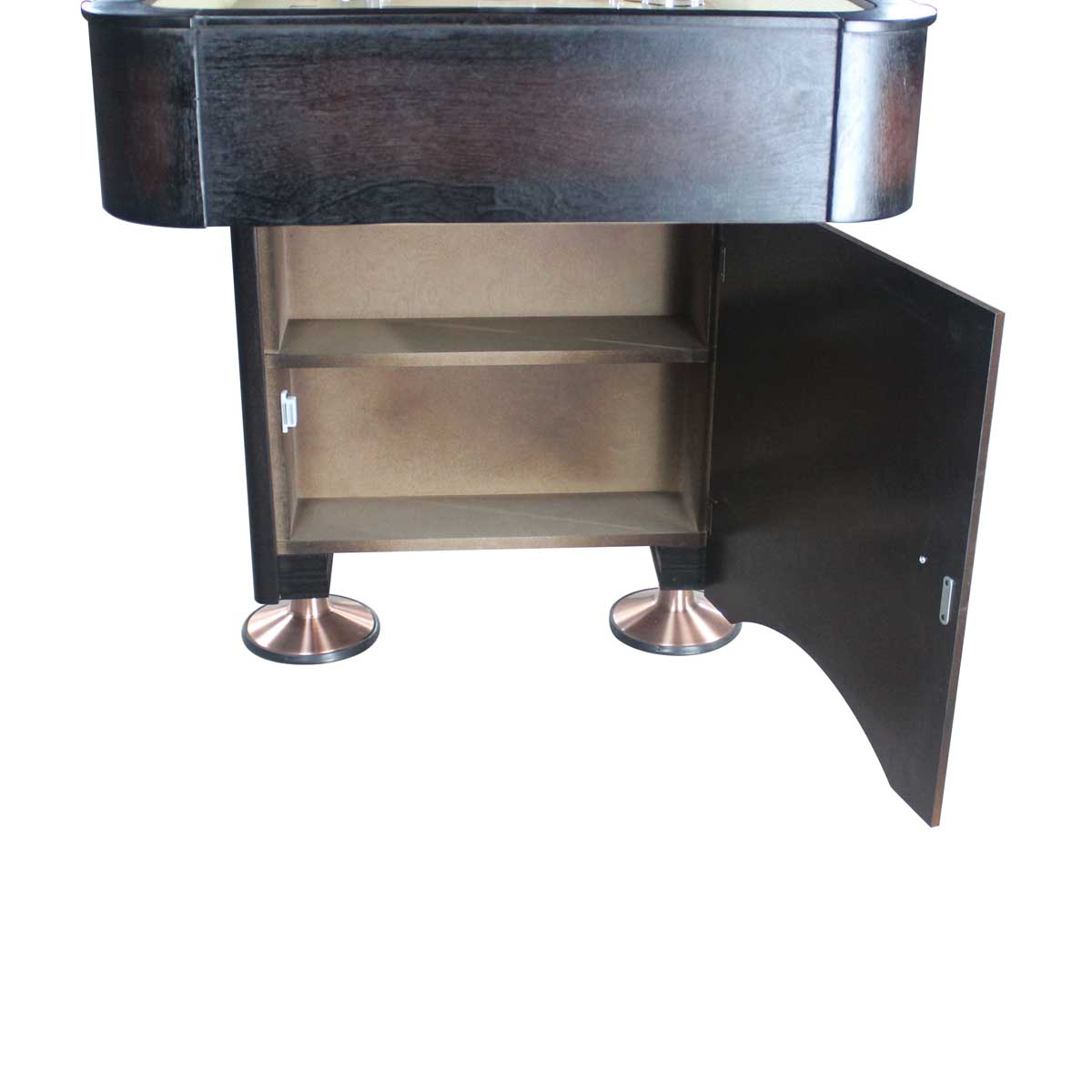 All Georgetown models are hand stained real wood laminate with a solid plywood framing structure. There is in leg storage, abacus bead scoring, speed wax and 8 deluxe pucks.