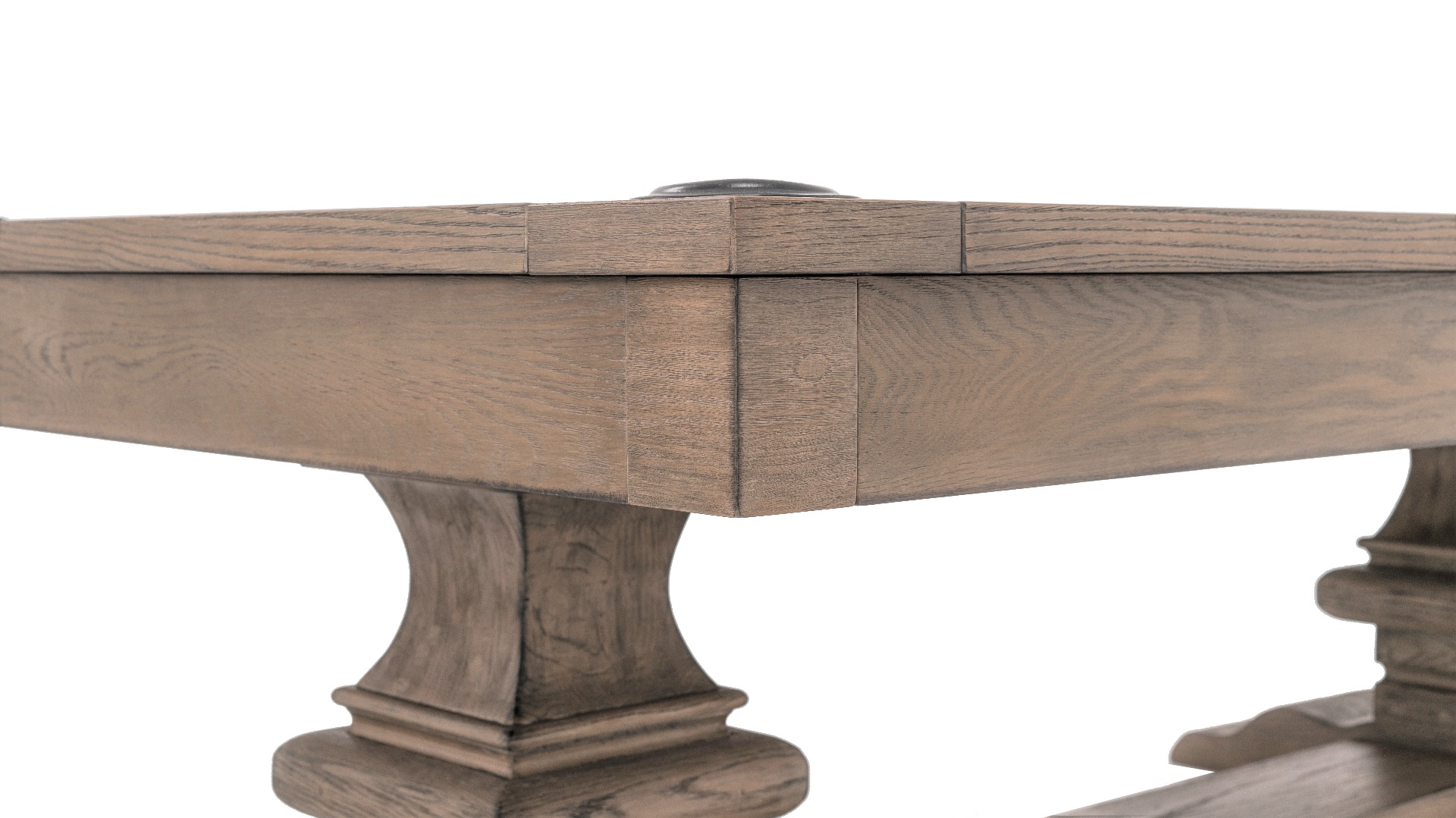 The Beaumont Pool Table by Plank & Hide combines architectural strength with refined style, standing on a solid oak or reclaimed elm trestle base finished in antique silver. With double 4" x 2" interlocking main beams that offer 66% more slate support, a one-piece leg design for unmatched stability, and a 100% solid wood cabinet and frame, this table is built for lasting performance. Its 6.5" oversized hardwood rails, K66 tournament cushions, genuine leather drop pockets, and 1" framed slate deliver accurate, professional-level play in a design that's as durable as it is elegant.