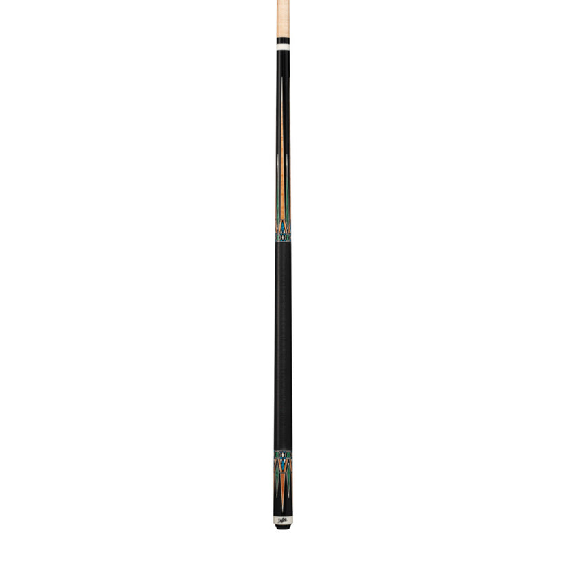 Black with antique maple playing cue with malachite, and blue and white recon. Finished with an Irish linen wrap