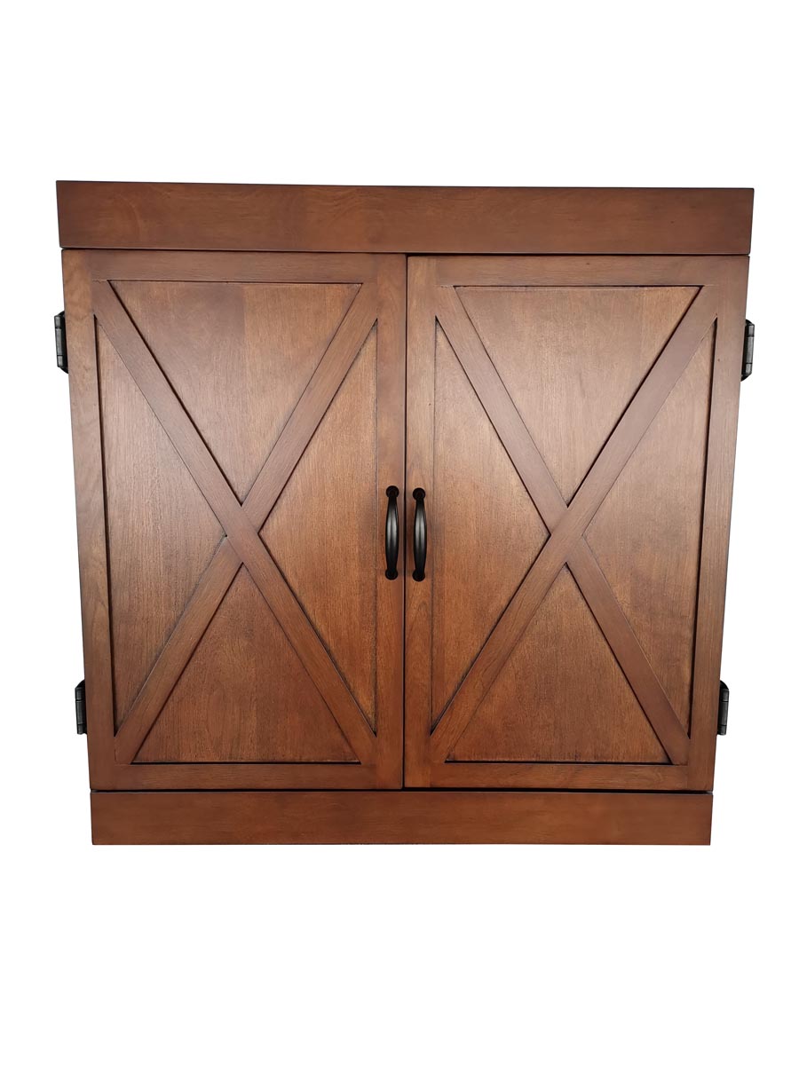 Add authentic pub style to your game room, rec room, or man cave with the Farmington Dart Cabinet Set. This handsome cabinet is handcrafted from solid, poplar wood, accented with matte-black hardware, and finished in a walnut stain. Farmhouse-inspired doors conceal your dartboard and accessories when not in use. The black, felt-lined backboard protects your wall during play. Allowing you to play in dim lighting, the Farmington's unique lighting system is the finishing touch to your pub-inspired space. A regulation-sized and self-healing sisal dartboard is great for tournaments or casual competitions. Two, chalk scoreboards are conveniently mounted on each door. Includes everything required for a regulation darts game. 180-day limited warranty.