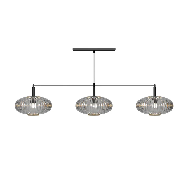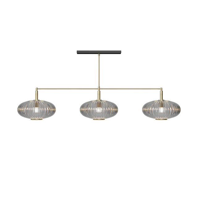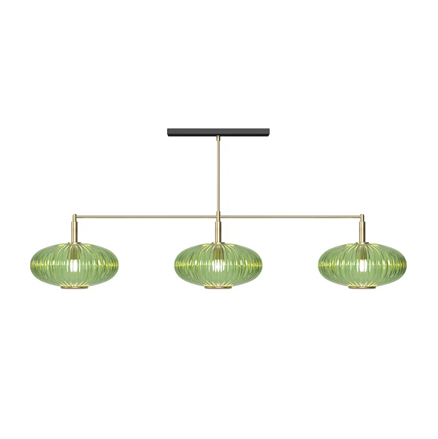 The 3 Glass Shade 54" Light Pendant is available in both brass and matte black finishes, paired with your choice of vintage-inspired green, blue, or smoke glass shades with brass accents.