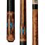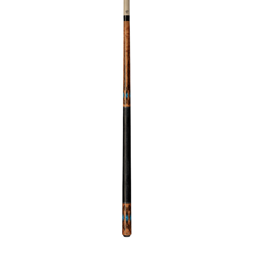 This modern classic Pure X cue features an antique golden-stained Birdseye Maple forearm and butt with floating split graphic lacewood points, turquoise accent diamonds, black lizard print embossed leather wrap, wood butt cap, and Pure X HXT Low Deflection Technology Shaft.