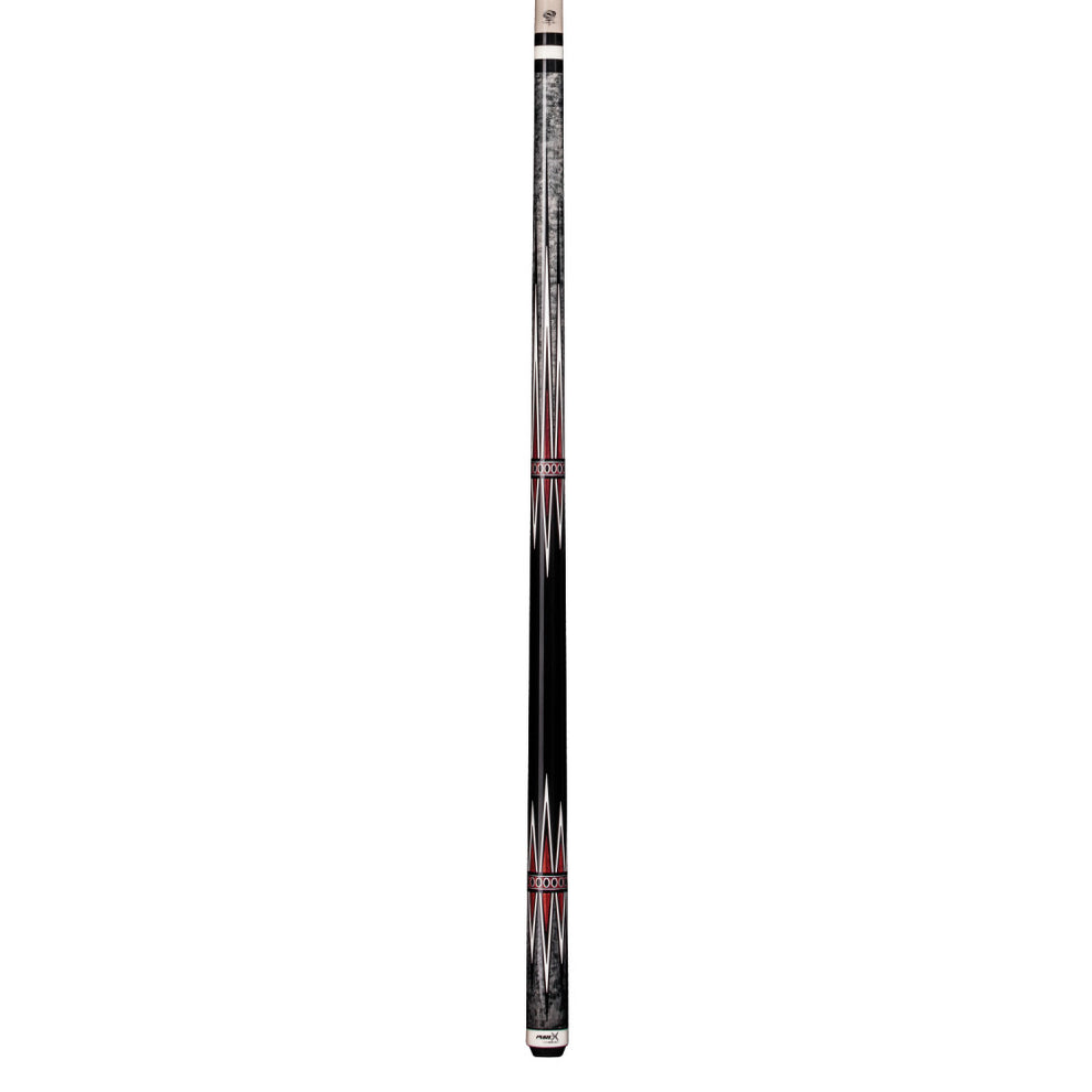 This classic Pure X cue features a Smoke Grey Birdseye Maple forearm and sleeve with cocobolo, black and imitation bone graphic decal, sleek wrapless handle, matte black implex joint collar and butt cap, and Pure X HXT Low Deflection Technology Shaft.